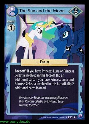 | | Faceoff: If you have Princess Luna or Princess Celestia involved in this faceoff, flip an additional card. If you have Princess Luna and Princess Celestia involved in this faceoff, flip 2 additional cards instead. |